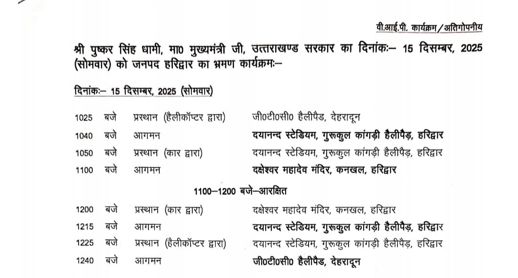 उत्तराखंड के मुख्यमंत्री पुष्कर सिंह धामी आज 15 दिसंबर को धर्मनगरी हरिद्वार के दौरे पर रहेंगे। मुख्यमंत्री धामी आज सुबह 10 बजकर 25 मिनट पर राजधानी दून स्थित GTC हेलीपैड से उड़ान भरेंगे, जिसके बाद मुख्यमंत्री धामी तकरीबन 10 बजकर 40 मिनट पर हरिद्वार स्थित गुरुकुल कांगड़ी के दयानंद स्टेडियम हेलीपैड पहुंचेंगे।