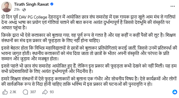 इस घटना पर कड़ी प्रतिक्रिया देते हुए पूर्व मुख्यमंत्री तीरथ सिंह रावत ने कहा कि शिक्षण संस्थानों के मंच इस प्रकार की फूहड़ता के लिए नहीं होने चाहिए और इससे देवभूमि की संस्कृति को गहरा आघात पहुंचा है। उन्होंने स्थानीय कलाकारों को मंच देने और स्वस्थ प्रतिस्पर्धा को बढ़ावा देने की आवश्यकता पर भी जोर दिया।