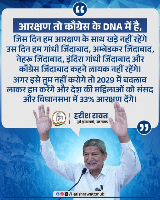 हरीश रावत ने कहा कि भाजपा कांग्रेस को हल्के में न ले, कांग्रेस के पास भी यशपाल आर्य,प्रीतम सिंह और हरीश धामी सरीखे विधायक हैं जो सत्ता पक्ष को माकूल जवाब देंगे। बहरहाल हरदा ने अपने फेसबुक पर दो पोस्ट अपलोड की हैं। जिसमें उन्होने लिखा है कि –“आरक्षण तो कांग्रेस के DNA में है। जिस दिन हम आरक्षण के साथ खड़े नहीं रहेंगे, उस दिन हम “गांधी जिंदाबाद”, “अंबेडकर जिंदाबाद”, “नेहरू जिंदाबाद”, “इंदिरा गांधी जिंदाबाद” और “कांग्रेस जिंदाबाद” कहने के लायक नहीं रहेंगे। अगर इसे तुम नहीं करोगे, तो 2029 में बदलाव लाकर हम करेंगे और देश की महिलाओं को संसद और विधानसभा में 33% आरक्षण देंगे”।