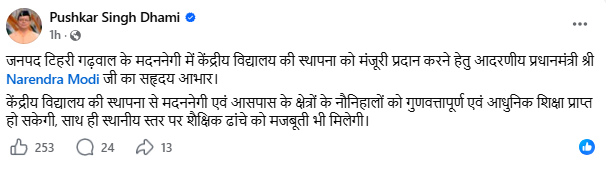 बहरहाल सीएम धामी ने जहां इसके लिए पीएम का शुक्रिया अदा किया है वहीं उन्होने कहा कि केंद्रीय विद्यालय खुलने से मदननेगी एवं आसपास के क्षेत्र में नौनिहालों को गुणवत्तापूर्ण शिक्षा मिलेगी। साथ ही स्थानीय स्तर पर शैक्षणिक ढांचे को भी मजबूती मिलेगी। उन्होंने कहा कि केंद्र एवं राज्य सरकार मिलकर युवाओं को शिक्षा के क्षेत्र में आगे लाने एवं उनके भविष्य को संवारने के लिए संकल्पित है।